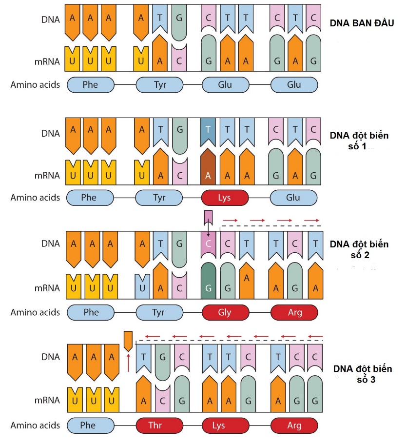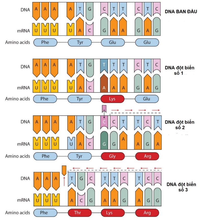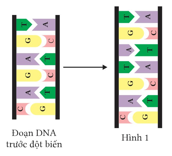 | Loại đột biến | Thay thế một cặp A-T bằng một cặp T-A | Mất một cặp A-T | Thay thế một cặp C-G bằng một cặp G-C | Thêm một cặp G-C |