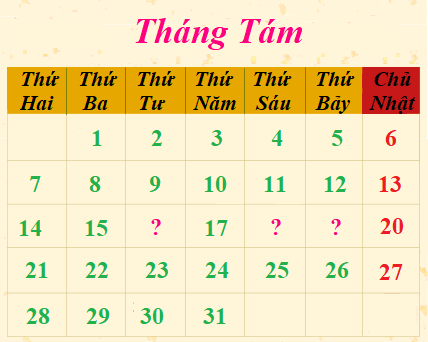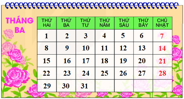 Ta có: tháng 1, tháng 3, tháng 5, tháng 7, tháng 8, tháng 10, tháng 12 có 31 ngày.