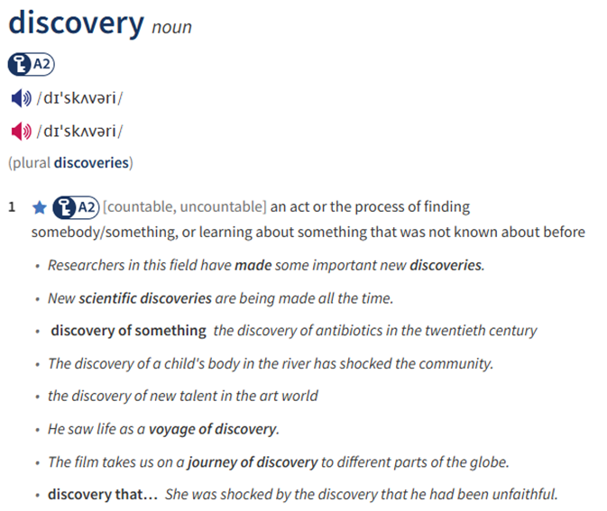 Question 19-20. Look at the entry of the word “discovery” in a dictionary. Use what you can get from the entry to complete the sentences with TWO or THREE words.