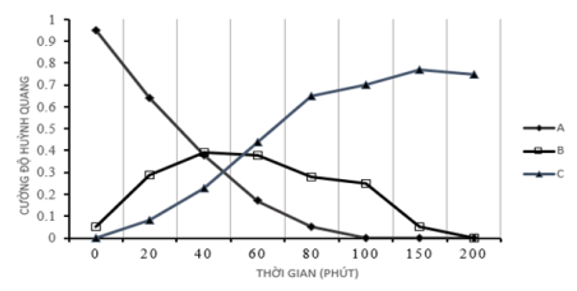 Trong một thí nghiệm, các nhà nghiên cứu sử dụng kính hiển vi để theo dõi đường đi của proteine dung hợp ở một tế bào động vật có vú. Gen mã hóa protein huỳnh quang ở loài sứa (Aequorea victoria) được ghép với gen mã hóa protein X của virus, sự biểu hiện của gene ghép tạo ra “proteine dung hợp” vẫn giữ được chức năng sinh học bình thường. Sau khi cho tế bào lây nhiễm với virus người ta quan sát thấy có sự thay đổi cường độ huỳnh quang theo thời gian ở 3 vị trí A, B, C trong tế bào.