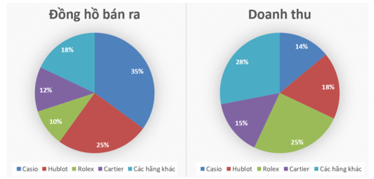 Hai biểu đồ dưới đây cho thấy thị phần các công ty đồng hồ theo số lượng đồng hồ được bán ra và theo doanh thu năm 2019. Biết rằng số đồng hồ bán ra trong năm là 1200 máy và doanh thu là 1,33 triệu USD. Quan sát biểu đồ và trả lời câu hỏi sau: