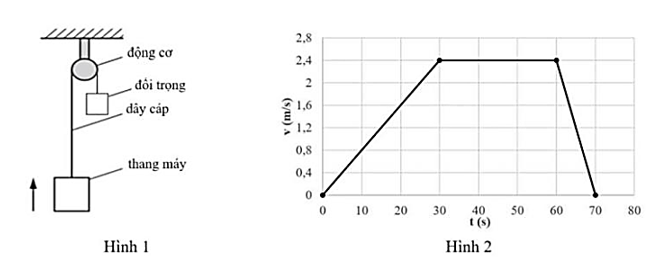 Một thang máy có khối lượng 1300 kg được kéo lên theo phương thẳng đứng bằng dây cáp nối với một động cơ như hình 1. Hình 2 là đồ thị biểu diễn sự biến thiên tốc độ v (m/s) của thang