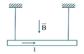 Treo một đoạn dây dẫn có chiều dài $L = 5\,\text{cm}$, khối lượng $m = 5\,\text{g}$ bằng hai dây mảnh, nhẹ sao cho dây dẫn nằm ngang. Biết cảm ứng từ của từ trường hướng thẳng đứng xuống dưới, có độ lớn $B = 0.5\,\text{T}$ và dòng điện chạy qua dây dẫn là có cường độ $I = 2\,\text{A}$, chiều dòng điện như hình bên. Lấy $g = 10\,\text{m/s}^2$.