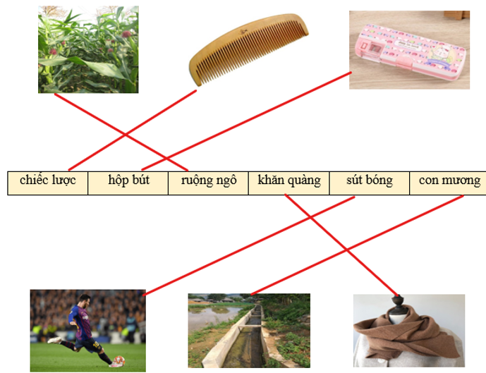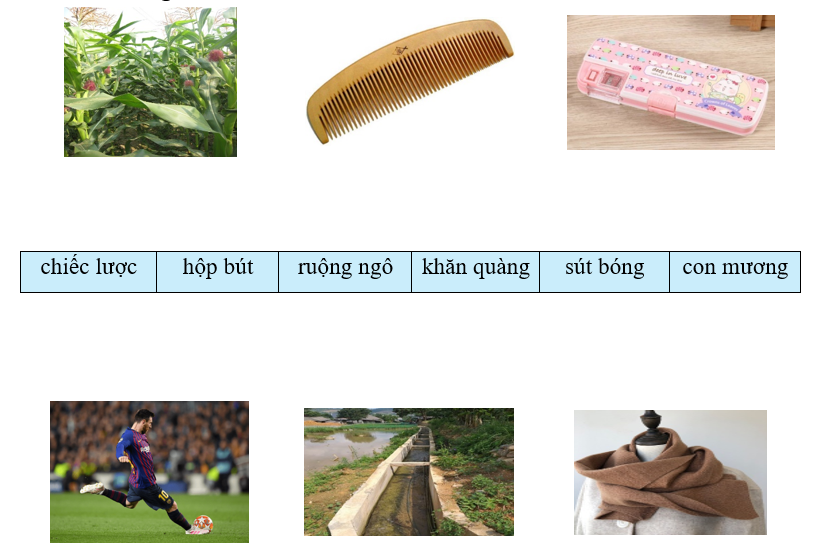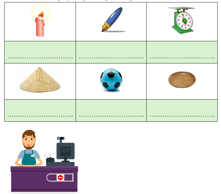Những mặt hàng có trong cửa hàng: cây nến, bút mực, cái cân, nón lá, quả bóng, cái đĩa.