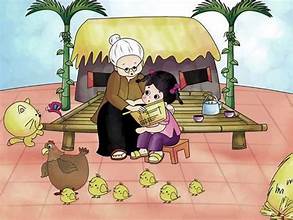 Bà tôi đã ngoài sáu mươi tuổi. Mái tóc bà đã điểm bạc, luôn được búi cao gọn gàng. Mỗi khi gội đầu xong, bà thường xoã tóc để hong khô. Tôi rất thích lùa tay vào tóc bà, tìm những sợi tóc sâu. Ngày nào cũng vậy, vừa tan trường, tôi đã thấy bà đứng đợi ở cổng. Trông bà thật giản dị trong bộ bà ba và chiếc nón lá quen thuộc. Bà nở nụ cười hiền hậu, nheo đôi mắt đã có vết chân chim âu yếm nhìn tôi. Rồi hai bà cháu cùng đi về trên con đường làng quen thuộc. Bóng bà cao gầy, bóng tối nhỏ bé, thấp thoáng trong bóng lá và bóng nắng. Tối nào, bà cũng kể chuyện cho tôi nghe. Giọng bà ấm áp đưa tôi vào giấc ngủ. Trong lúc mơ màng, tôi vẫn cảm nhận được bàn tay ram ráp của bà xoa nhẹ trên lưng.