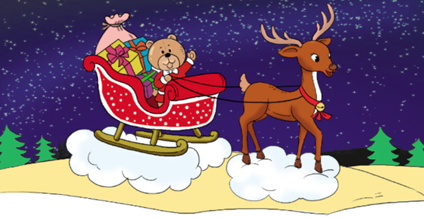 Khi chú gấu tỉnh dậy, trời đã tối. Bỗng chú nghe thấy tiếng nhạc leng keng. Rồi một chiếc xe tuần lộc hiện ra. Đó là xe đi phát đồ chơi cho trẻ nhỏ. Bởi vì đêm ấy là đêm Giáng sinh rồi. Nhưng không may, Ông già Nô-en bị ốm nên chỉ có tuần lộc vừa kéo xa vừa phát quà.