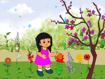 Mùa xuân, cô bé đi vào trong vườn, hoa đào đang nở rợp một màu hồng. Cô gọi: