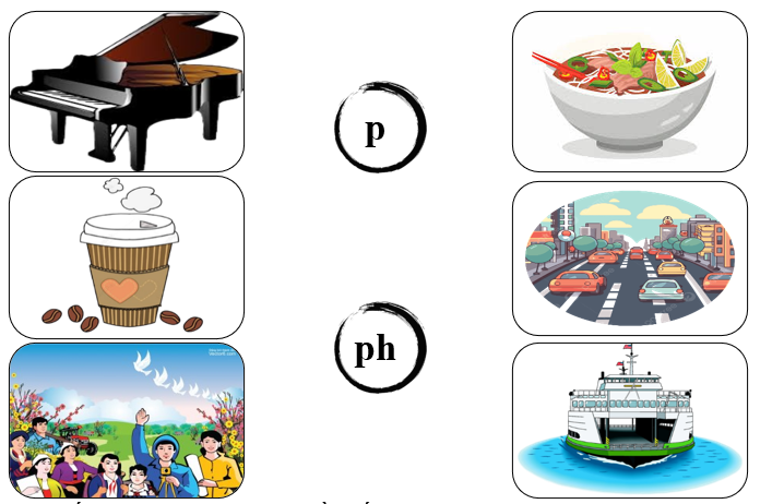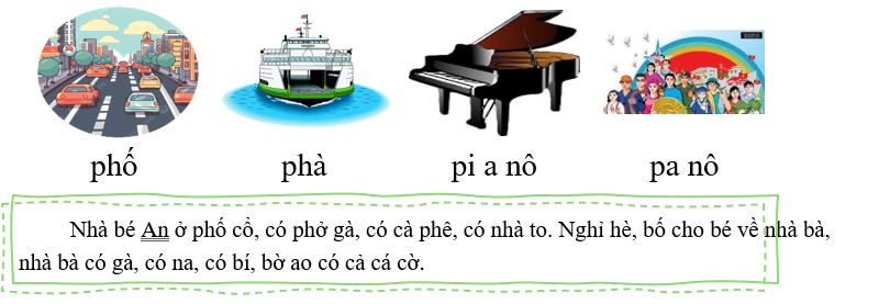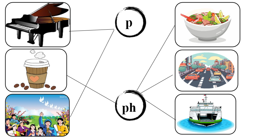- Các chữ có chữ “ph” là: phà, phố, phở.