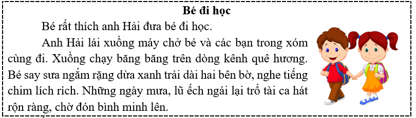 b) Anh Hải lái xuồng máy chở bé và các bạn trong xóm cùng đi học.