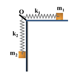 Sử dụng dữ kiện sau đề giải câu 80 đến câu 82: Cho cơ hệ như hình bên. Biết k1=50 N/m; k2=40 N/m; m1=m2=200 g. Từ vị trí cân bằng của các vật, kéo chúng để lò xo giãn thêm 2cm.