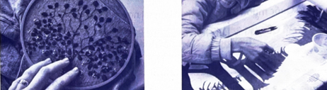 Những người trong hình đang làm nghề thủ công, như thêu tranh và cắt dán tranh giấy nghệ thuật.