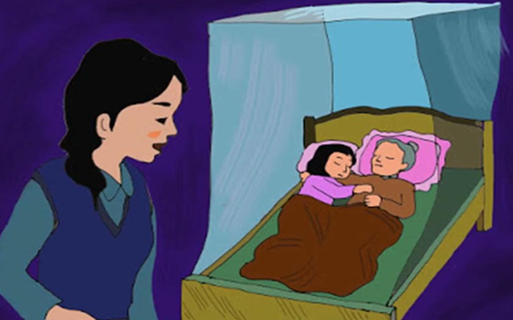 Từ đó, đêm nào Lan cũng ngủ với bà. Nửa đêm, mẹ không yên tâm, sợ bé Lan kéo chăn của bà nên mẹ rón rén vào buồng xem sao. Mẹ thấy bé Lan đang ôm bà, ngủ ngon lành, còn bà hình như đang thì thầm: “Ấm quá, cháu của bà ngoan quá!”.