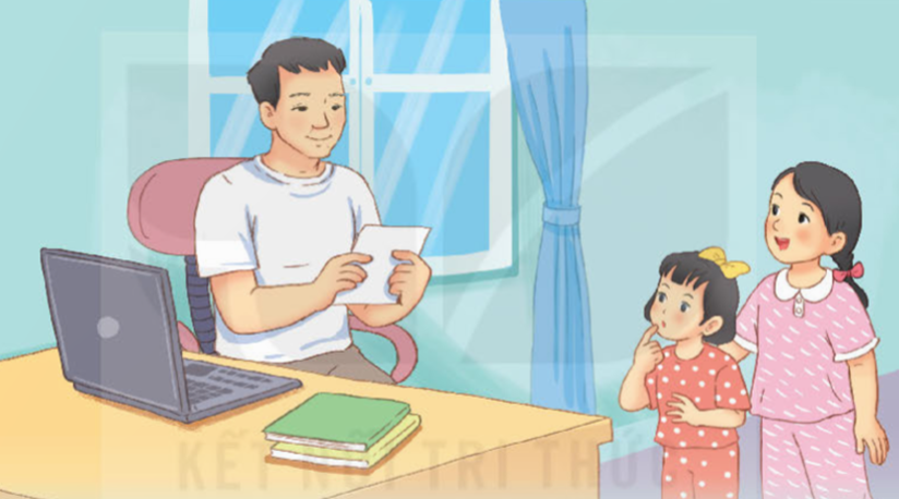 Hai chị em hồi hộp nhìn bố. Bố ngạc nhiên mở quà, đọc chăm chú. Rồi bố cười giòn giã: