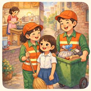 Hàng năm, đơn vị sẽ phân công ca làm việc. Khi thì mẹ Hồng làm ca sáng, lúc lại làm tối muộn. Ba Hồng ngoài làm ciệc theo ca đã phân công thì còn làm thêm việc phân loại rác và bốc vác hàng nặng ngoài bãi. Công việc rất vất vả nhưng cả hai cô chú luôn vui vẻ, yêu nghề và yêu đời, chăm sóc cho Hồng đầy đủ. Hồng thương ba mẹ lắm. Em luôn lo lắng ba mẹ đi làm sớm, về muộn sẽ bị đói, bị lạnh. Vì vậy, khi đi học về sớm em sẽ phụ mẹ nấu cơm, dọn dẹp nhà cửa.