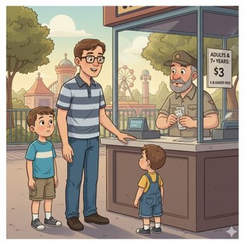 Người bán vé trả lời: “3 đô la một vé cho người lớn và trẻ em trên sáu tuổi. Trẻ em từ sáu tuổi trở xuống được vào cửa miễn phí. Các cậu bé này bao nhiêu tuổi?”