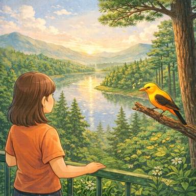 Tôi đang mơ màng tưởng tượng thì chợt vang lên tiếng chim hoàng anh hót. Tôi đưa mắt nhìn xem chim đậu ở đâu mà hót. Mỗi lần nghe tiếng chim hoàng anh là tôi phải nghĩ đến những cây bàng xanh mướt, vòm trời xanh có mây nhẹ như bông. Đà Lạt có chim hoàng anh hót là điều tôi không bao giờ ngờ. Nhưng kìa, trên một cây thông gãy có một chú hoàng anh nhỏ đang mổ vỏ thông tìm mồi. Mình chim thon thon, lông mượt màu vàng nghệ, hoà hợp với giọng hót ấm áp. Óc tôi đột nhiên thấy êm ái vô cùng.