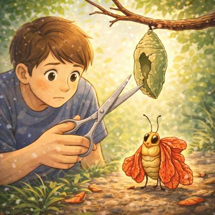 Có một anh chàng tìm thấy một cái kén bướm. Một hôm anh ta thấy kén hé ra một lỗ nhỏ. Anh ta ngồi hàng giờ nhìn chú bướm nhỏ cố thoát mình ra khỏi cái lỗ nhỏ xíu. Rồi anh ta thấy mọi việc không tiến triển gì thêm. Hình như chú bướm không thể cố được nữa. Vì thế, anh ta quyết định giúp chú bướm nhỏ. Anh ta lấy kéo rạch lỗ nhỏ cho to thêm. Chú bướm dễ dàng thoát ra khỏi cái kén nhưng thân hình nó thì sưng phồng lên, đôi cánh thì nhăn nhúm. Còn chàng thanh niên thì ngồi quan sát với hi vọng một lúc nào đó thân hình chú bướm sẽ xẹp lại và đôi cánh đủ rộng hơn để nâng đỡ thân hình chú. Nhưng chẳng có gì thay đổi cả! Thật sự là chú bướm phải bò loanh quanh suốt quãng đời còn lại với đôi cánh nhăn nhúm và thân hình sưng phồng. Nó sẽ không bao giờ bay được nữa. Có một điều mà người thanh niên không hiểu: cái kén chật chội khiến chú bướm phải nỗ lực mới thoát ra khỏi cái lỗ nhỏ xíu kia chính là quy luật của tự nhiên tác động lên đôi cánh và có thể giúp chú bướm bay ngay khi thoát ra ngoài.