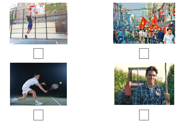 Audio script: 1. A: What's the street like? B: It's a busy street. 2. A: What does he do? B: He's a farmer. 3. A: What does your brother look like? B: He's tall. 4. A: What does your father do on Sundays? B: He plays tennis. |