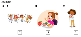 Dựa vào các bức tranh ta đánh số: 1. A, 2. C, 3. B