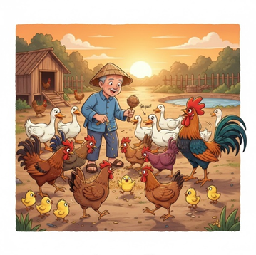 Chiều chiều, khi mặt trời gần lặn, chú tôi lại đánh một hồi mõ rồi tung thóc ra sân. Nghe hiệu lệnh ấy, hơn bốn chục con gà vịt chạy tíu chân, đổ về quây quần lấy một góc. Tiếng vỗ cánh, tiếng chí chóe hỗn loạn. Cả bầy xô vào tranh nhau ăn.
