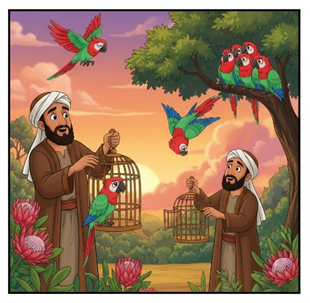 Người lái buôn mở lồng mang vẹt ra, ông để vẹt lên bàn tay ngắm nghía. Đột nhiên chú vẹt bay vù lên cây cao, đứng nhìn ông và nói: “Cảm ơn ông chủ đã thuật lại cách bạn tôi giúp tôi được tự do. Tôi xin chào ông để trở về rừng núi quê hương”. Thế rồi, vẹt cất cánh nhằm hướng tây nam bay thẳng.