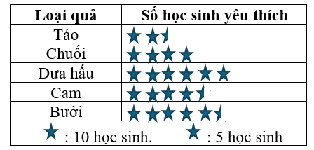 Số học sinh yêu thích quả cam là \(4 \cdot 10 + 1 \cdot 5 = 45\) (bạn).