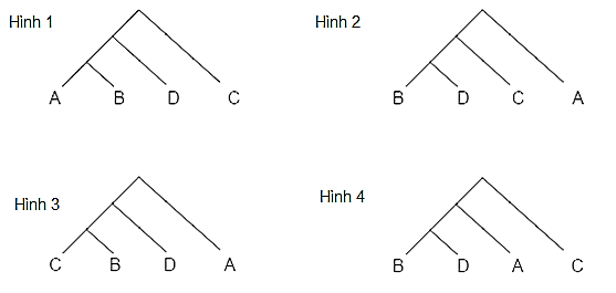Bảng sau đây mô tả dữ liệu về sự thay thế amino acid trong chuỗi α của hemoglobin ở bốn loài động vật có vú khác nhau A, B, C và D. Trên cơ sở các dữ liệu được hiển thị trong bảng, chọn cây tiến hóa hình bao nhiêu là phù hợp nhất?