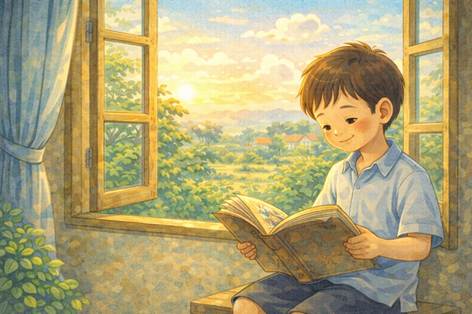 Cuốn sách nhỏ đặt bên khung cửa sổ đã theo tôi suốt những năm tiểu học. Mỗi buổi chiều, khi nắng nhạt dần, tôi lại mở sách ra đọc. Những trang sách đưa tôi đến những miền đất xa lạ, gặp gỡ những con người dũng cảm và nhân hậu.