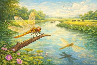 Ôi chao! Chú chuồn chuồn nước mới đẹp làm sao ! Màu vàng trên lưng chú lấp lánh. Bốn cái cánh mỏng như giấy bóng. Cái đầu tròn và hai con mắt long lanh như thuỷ tinh. Thân chú nhỏ và thon vàng như màu vàng của nắng mùa thu. Chú đậu trên một cành lộc vừng ngả dài trên mặt hồ. Bốn cánh khẽ rung rung như còn đang phân vân.