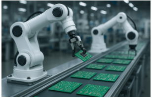 Hình ảnh thể hiện cánh tay robot đang tạo ra các bảng mạch. Đây là công việc đặc trưng của ngành sản xuất, chế tạo thiết bị điện tử.