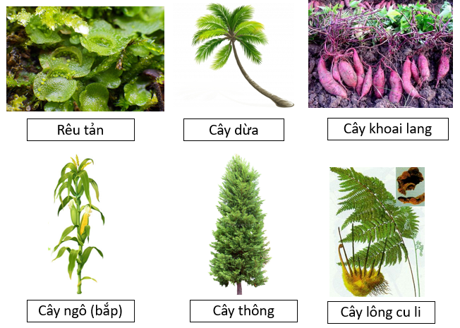 Rêu tản, cây dừa, cây khoai lang, cây ngô, cây thông, cây lông cu li.