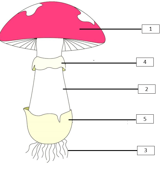 1 – mũ nấm, 2 – cuống nấm, 3 – sợi nấm, 4 – vòng cuống nấm, 5 – bao gốc nấm.