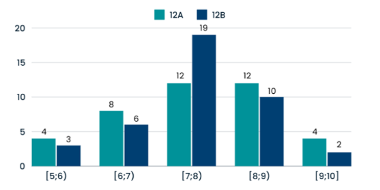 Biểu đồ cột dưới đây là thông tin điểm thi môn Toán của hai lớp 12 A và 12 B.
