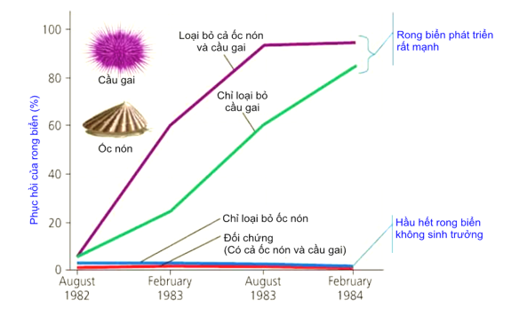- Thí nghiệm 2 (TN2): Loại bỏ loài cầu gai ra khỏi khu vực rong biển sinh sống.