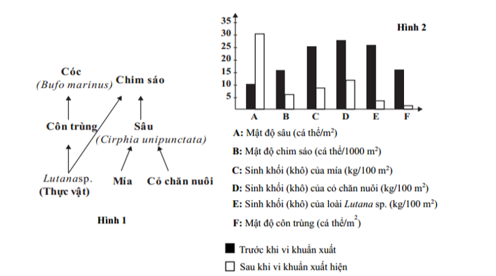 Hình 1 thể hiện một phần lưới thức ăn trên cánh đồng trồng cỏ chăn nuôi và mía ở đảo Hawaii. Hình 2 thể hiện sự thay đổi số lượng, sinh khối của một số loài trong quần xã trước và sau khi một loài vi khuẩn chỉ gây bệnh trên cóc (Bufo marinus) xuất hiện làm số lượng cóc giảm mạnh.