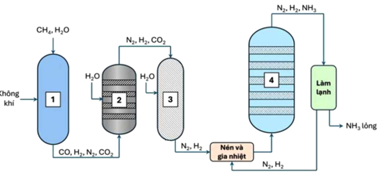 Ngày nay, các quy trình sản xuất ammonia vẫn dựa trên quy trình cơ bản Haber – Bosch, nhưng được cải tiến kết hợp với quy trình xử lí nguyên liệu đầu vào. Hình dưới đây là sơ đồ mô tả quy trình sản xuất ammonia với nguyên liệu đầu vào là khí thiên nhiên (thành phần chủ yếu là methane), nước và không khí