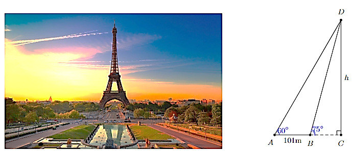 (1,5 điểm) Trong một lần đến tham quan tháp Eiffel (Paris, Pháp), bạn Vân muốn ước tính độ cao của tháp. Sau khi quan sát, bạn Vân đã minh họa lại kết quả đo đạc như hình dưới đây.