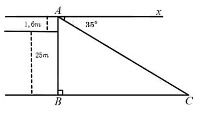 (1,5 điểm) Một người có tầm mắt cao \[1,6{\rm{ m}}\] đứng trên sân thượng của một tòa nhà cao \[{\rm{25 m}}\] nhìn thấy một chiếc xe đang đứng yên với góc nghiêng xuống \[35^\circ \] (như hình vẽ).