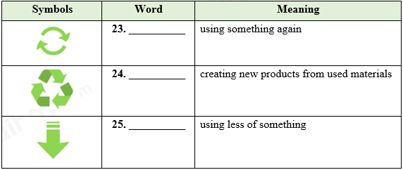 V. Look at the table below about the “three Rs”. Fill in the blanks with the suitable meaning of Reduce – Reuse – Recycle.