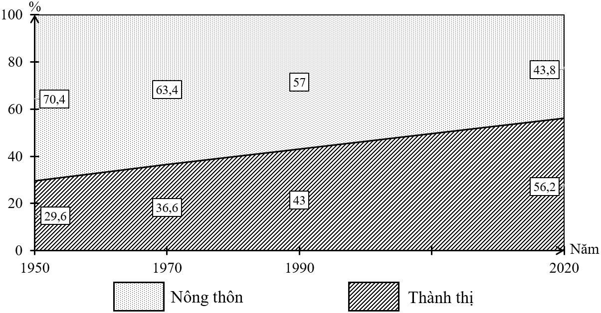 Theo bảng số liệu, dạng biểu đồ nào sau đây thích hợp nhất để thể hiện cơ cấu dân số phân theo thành thị và nông thôn của thế giới trong năm 1950 và 2020?