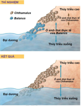 Dùng thông tin sau để trả lời 2 câu hỏi tiếp theo: Nhà sinh thái học Joseph Connell đã tiến hành nghiên cứu về hai loài hà sống ở biển là Chthamalus stellatus và Balanus balanoides. Hai loài này phân bố ở các tầng cao thấp khác nhau trên vách đá dọc theo bờ biển Scotland. Loài Chthamalus thường sống ở vùng cao hơn so với loài Balanus phân bố ở các khu vực thấp hơn. Để kiểm tra xem sự phân bố của loài Chthamalus có bị ảnh hưởng bởi cạnh tranh từ loài Balanus hay không, Connell đã thực hiện một thí nghiệm bằng cách loại bỏ loài Balanus khỏi một số khu vực trên vách đá (hình bên dưới).