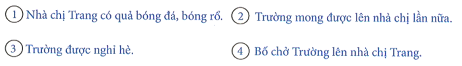 Tháng năm đến, Trường được nghỉ hè. Bố chở Trường lên nhà chị Trang. Nhà chị Trang có quả bóng đá, bóng rổ. Về nhà, Trường hứa sẽ cố gắng học tốt để bố cho lên nhà chị Trang lần nữa.