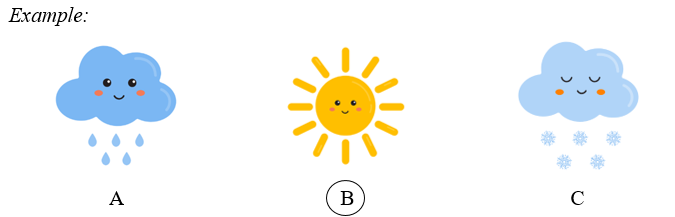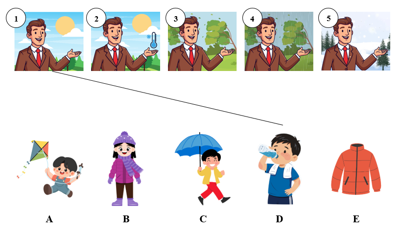 Thông tin: “Today, wear a scarf, a hat, gloves and a coat because it’s snowy.” → Trong hình là dự báo trời có tuyết, nên quàng khăn, đội mũ, đeo găng tay, và mặc áo khoác dày → nối bức ảnh số 5 với B.