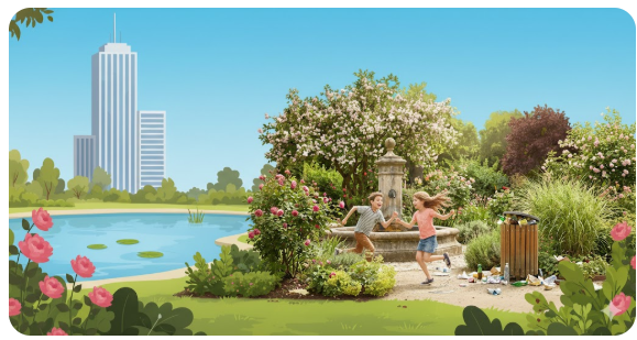 Dịch: Đây là một bức ảnh của Công viên Thành phố. Có một cái hồ nhỏ, nhiều cây và hoa. Ở giữa bức ảnh, có một đài phun nước.