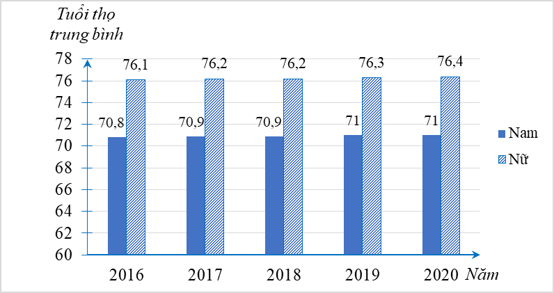 Biểu đồ cột kép dưới đây cho biết tuổi thọ trung bình của nam giới và nữ giới người Việt Nam ở các năm giai đoạn 2016 – 2020: