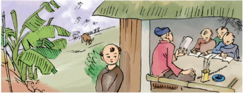 Sau vì nhà nghèo quá, chú phải bỏ học. Ban ngày, đi chăn trâu, dù mưa gió thế nào, chú cũng đứng ngoài lớp nghe giảng nhờ. Tối đến, chú đợi bạn học thuộc bài mới mượn vở về học. Đã học thì cũng phải đèn sách như ai nhưng sách của chú là lưng trâu, nền cát, bút là ngón tay hay mảnh gạch vỡ; còn đèn là vỏ trứng thả đom đóm vào trong. Bận làm, bận học như thế mà cánh diều của chú vẫn bay cao, tiếng sáo vẫn vi vút tầng mây. Mỗi lần có kì thi ở trường, chú làm bài vào lá chuối khô và nhờ bạn xin thầy chấm hộ. Bài của chú chữ tốt, văn hay, vượt xa các học trò của thầy.
