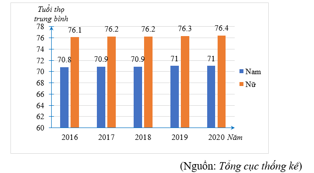 Biểu đồ cột kép dưới đây cho biết tuổi thọ trung bình của nam giới và nữ giới người Việt Nam ở các năm giai đoạn 2016 – 2020: