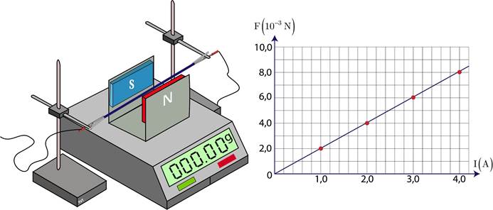 Một học sinh làm thí nghiệm đo cảm ứng từ B với bộ dụng cụ như ở hình vẽ. Chiều dài dây dẫn \(l = 10\,cm\) và thu được kết quả như ở đồ thị dưới đây: