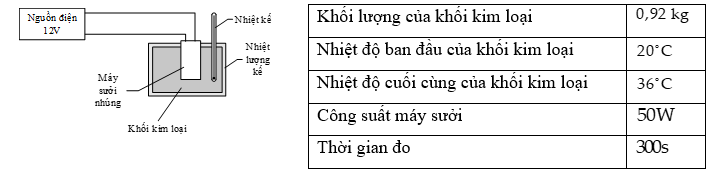 Nhiệt dung riêng của khối kim loại tính toán được là \[1091{\rm{ }}J/kg \cdot K.\]