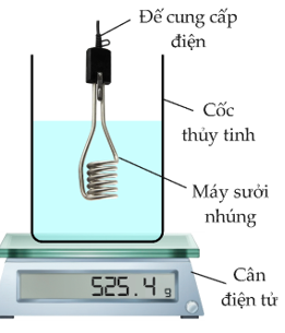 Một học sinh thực hiện một thí nghiệm để tìm nhiệt hóa hơi riêng của nước. Một cốc thủy tinh chứa nước được đặt trên cân điện tử. Nước được đun nóng bằng một máy sưởi nhúng \(100{\rm{ W,}}\) được nhúng trong nước sao cho không chạm vào cốc thủy tinh, như hình bên. Khi nước sôi, học sinh đọc số cân. Sau \({\rm{240 s,}}\) học sinh đọc lại số cân thu được kết quả như sau: